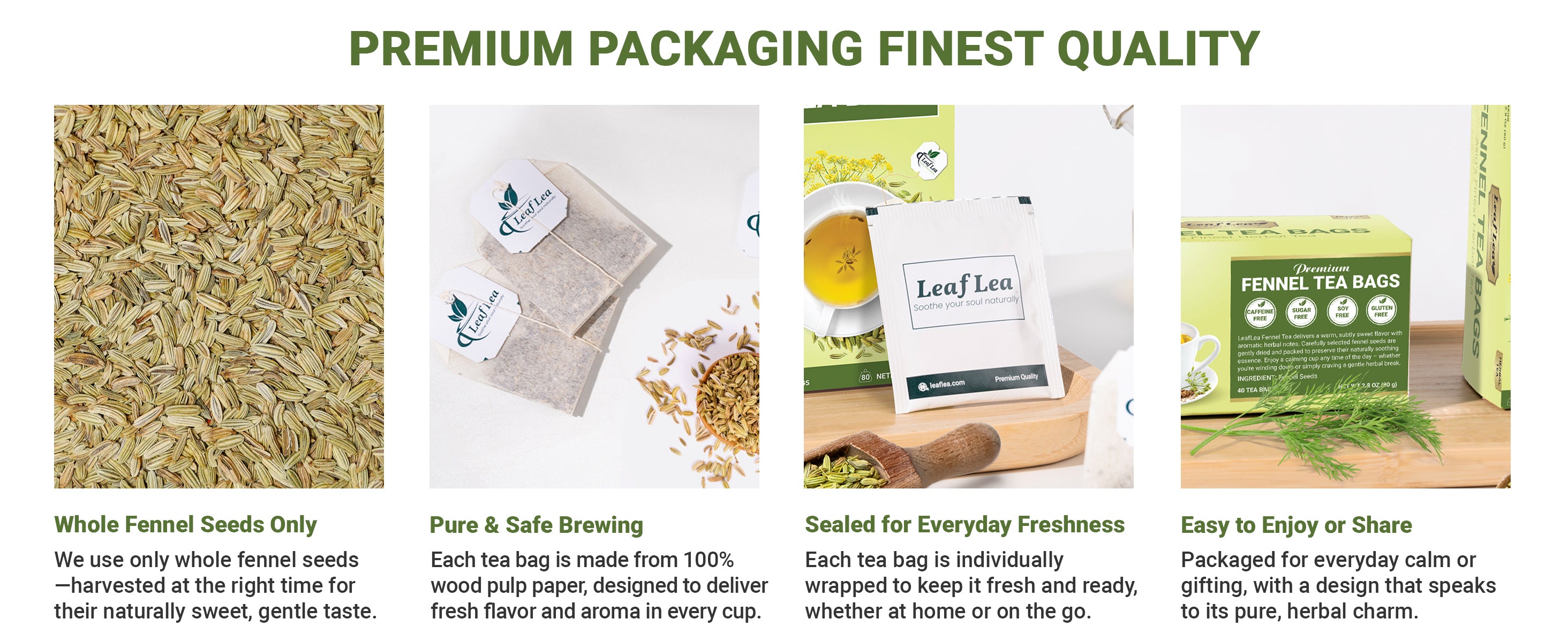 Thoughtful Selection: Each tea bag begins with dried fennel seeds chosen for consistency in size, freshness, and appearance. The seeds are handled in small, controlled lots and packed with care to ensure a clean, honest, and consistent herbal brew.