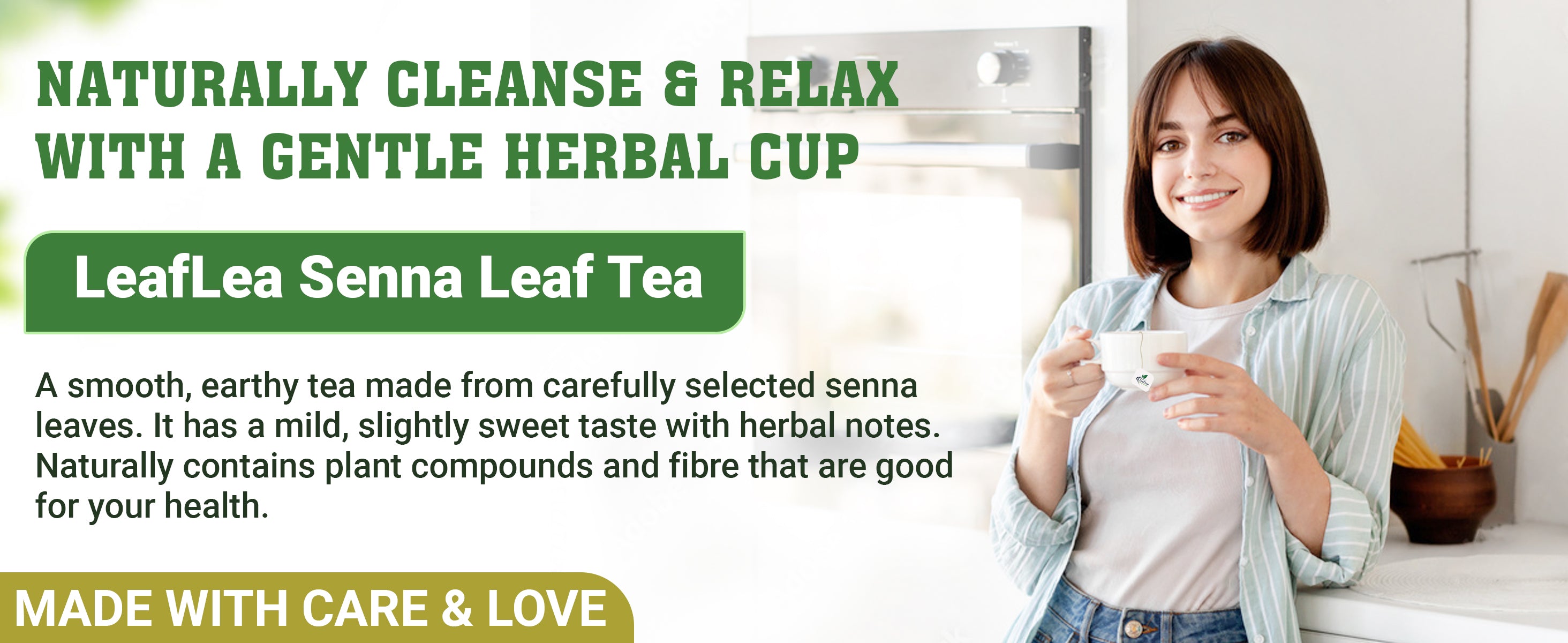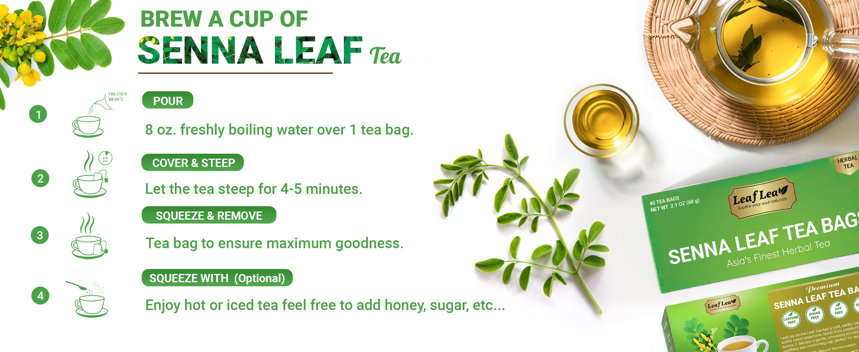 Made from 100% pure senna leaves, LeafLea’s tea contains no additives or artificial ingredients. Enjoy the naturally smooth and simple taste in every cup.